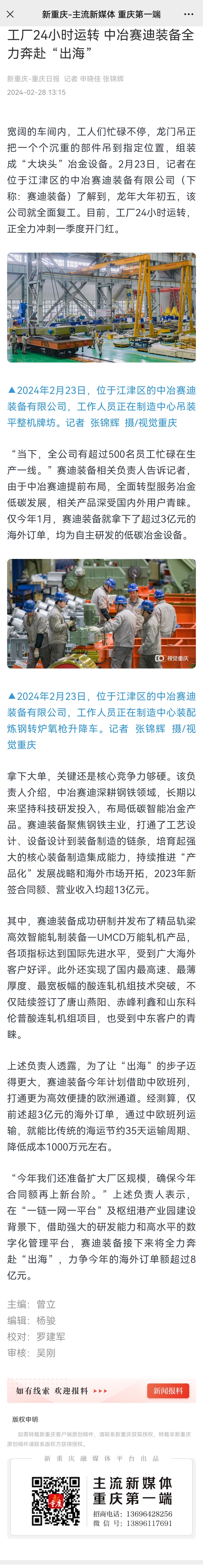2月28日,新重慶-重慶日報的記者來訪位于重慶市江津區(qū)的中冶賽迪裝備有限公司(簡稱賽迪裝備),了解賽迪裝備制造中心工人全力生產(chǎn)搶抓開門紅,報道了賽迪裝備自主研發(fā)的低碳冶金設(shè)備在國內(nèi)外市場的應(yīng)用情況等。