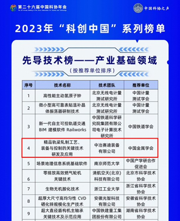7月2日,中國科學技術協(xié)會正式發(fā)布2023年“科創(chuàng)中國”系列榜單,中冶賽迪“精品軌梁軋制工藝裝備與控制關鍵技術”上榜產業(yè)基礎領域先導技術榜單。