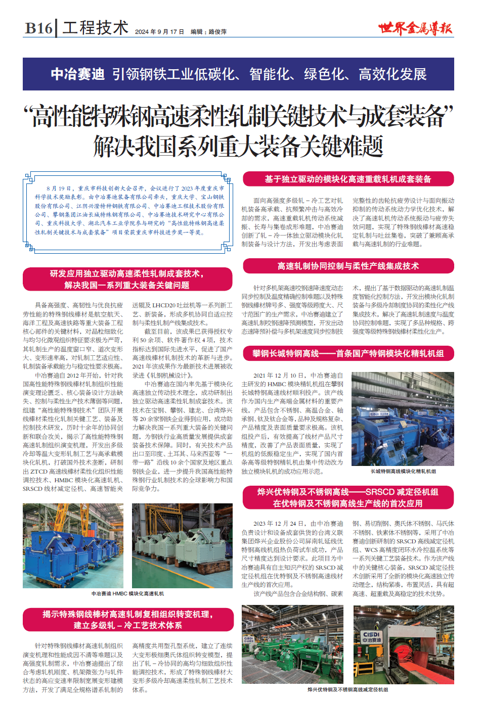 《世界金屬導報》專版報道中冶賽迪“高性能特殊鋼高速柔性軋制關鍵技術與成套裝備”